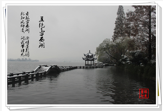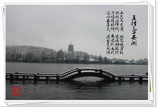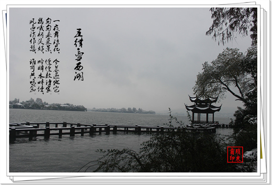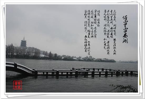 《五律·雪西湖》 一夜舞瓊花,今晨遍地它。 匆匆來采景,慢慢數(shù)詩家。 幽哦橋頭好,吟眸水畔佳, 風亭稍作憩,誰可共鳴笳。