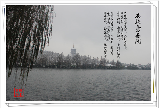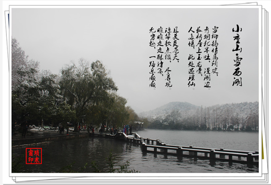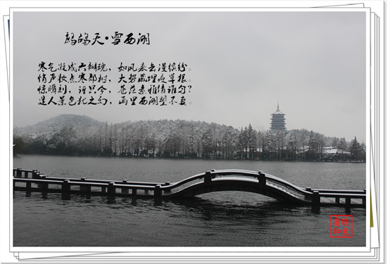 《鷓鴣天·雪西湖》 寒氣凝成六瓣魂,如風來去漫繽紛。 悄聲妝點寒郊樹,大勢藏埋瘦草根。 驚瞬刻,訝只今,蒼茫素雅倩誰勻? 迷人景色猶之幻,畫里西湖望不真。