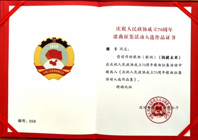 近日,公司退休職工珊卡創(chuàng)作的歌曲《鑄就未來》入選慶祝人民政協(xié)成立70周年歌曲作品集。此次征歌從全國近1400件作品中共評(píng)選歌曲35首,歌詞35首。佳作《鑄就未來》實(shí)力入選。 珊卡,原名姚春榮,曾任中國水電十二局第二建筑安裝公司工會(huì)主席,十二局退休職工。他創(chuàng)作有大量歌曲作品,1961年在《上海歌聲》發(fā)表處女作《高舉毛澤東思想紅旗》后,相繼在《歌曲》、《詞刊》、《解放軍歌曲》等報(bào)刊發(fā)表歌曲八百余首,省級(jí)以上二百余首。出版《珊卡歌曲選集》、《珊卡歌曲選》(211首)、《珊卡歌曲選•續(xù)集》(284首)。 還出版有《五十六根琴弦連北京》《綠色的歌》《月亮情歌》《綠色浙江》和《康定月亮》等。其中《五十六根琴弦連北京》1997年獲全國“五個(gè)一工程”獎(jiǎng),首都慶祝建國五十周年全國征歌一等獎(jiǎng)。1995年獲全國職工自學(xué)成才獎(jiǎng),受到中華全國總工會(huì)等單位人事部的聯(lián)合表彰。多次獲水電十二局精神文明類獎(jiǎng),三次榮立一等獎(jiǎng)。2006年《中國風(fēng)•漢語熱》被定為“全球華文教育促進(jìn)大會(huì)”永久性會(huì)歌,并與他創(chuàng)作的《西班牙中華婦女聯(lián)合會(huì)會(huì)歌》同時(shí)由僑聯(lián)國家博物館收藏。