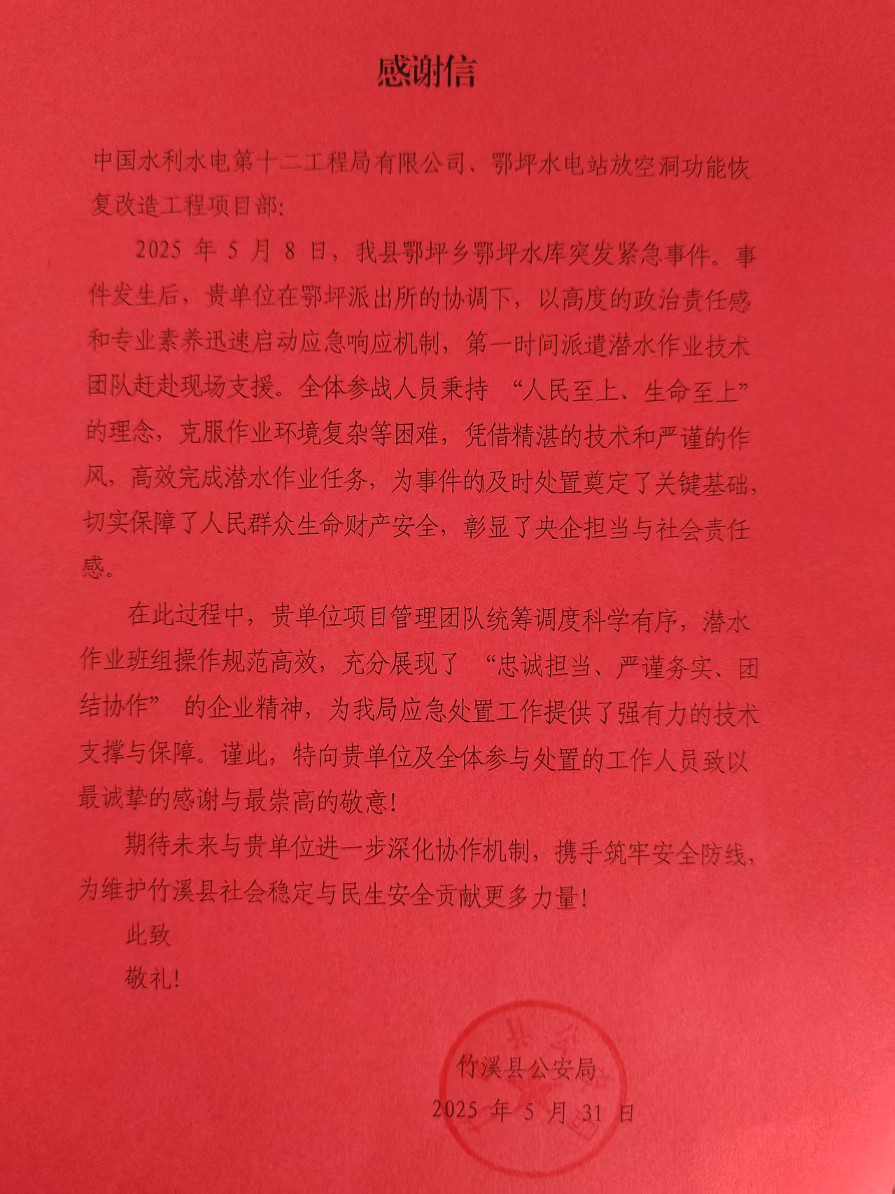7月1日,由水電十二局承建的鄂坪水電站放空洞功能恢復(fù)改造工程收到一封來(lái)自竹溪縣公安局的感謝信,信中向項(xiàng)目部5月8日在竹溪縣鄂坪鄉(xiāng)鄂坪水庫(kù)上游突發(fā)緊急事件中的出色應(yīng)急救援表現(xiàn)給予感謝與敬意。 5月8日,鄂坪水庫(kù)突發(fā)緊急事件,周邊人民的生命財(cái)產(chǎn)安全受到嚴(yán)重威脅。在鄂坪派出所協(xié)調(diào)下,鄂坪項(xiàng)目部迅速響應(yīng),第一時(shí)間啟動(dòng)應(yīng)急響應(yīng)機(jī)制,派遣擁有專(zhuān)業(yè)技術(shù)和充分經(jīng)驗(yàn)的潛水作業(yè)技術(shù)團(tuán)隊(duì)趕赴現(xiàn)場(chǎng)。面對(duì)復(fù)雜的作業(yè)環(huán)境,項(xiàng)目部救援人員不畏艱難險(xiǎn)阻,高效完成潛水作業(yè)任務(wù)。最終,在縣公安局的指揮和項(xiàng)目部全體人員的配合與努力下,事態(tài)成功得到控制。 此次鄂坪項(xiàng)目部的應(yīng)急救援行動(dòng)為事件及時(shí)處置奠定了關(guān)鍵基礎(chǔ),充分展示了“忠誠(chéng)擔(dān)當(dāng)、嚴(yán)謹(jǐn)務(wù)實(shí)、團(tuán)結(jié)協(xié)作”央企精神。未來(lái),鄂坪項(xiàng)目部將繼續(xù)踐行社會(huì)責(zé)任,加強(qiáng)與竹溪縣當(dāng)?shù)夭块T(mén)的緊密合作,深化應(yīng)急聯(lián)動(dòng)機(jī)制,共守地方安全,同時(shí),項(xiàng)目部也會(huì)將應(yīng)急救援中展現(xiàn)的擔(dān)當(dāng)精神融入日常工作,以更高標(biāo)準(zhǔn)、更嚴(yán)要求打造優(yōu)質(zhì)工程。