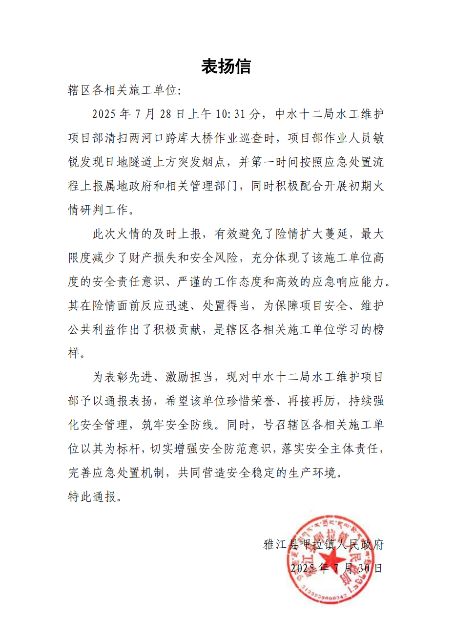 近日,由水電十二局承建的水工維護(hù)項目部收到一封來自雅江縣呷拉鎮(zhèn)人民政府的通報表揚(yáng)信。信中對7月28日項目部作業(yè)人員在日地隧道上方突發(fā)煙點事件中的出色應(yīng)急表現(xiàn)表達(dá)了肯定和贊許。 7月28日上午10時31分,水工維護(hù)項目部作業(yè)人員在兩河口跨庫大橋清掃作業(yè)巡查過程中,敏銳察覺日地隧道上方突發(fā)煙點,面對突如其來的險情,項目部人員沉著冷靜,迅速按照應(yīng)急流程,在第一時間向?qū)俚卣跋嚓P(guān)部門進(jìn)行上報,同時積極配合對初期火情的專業(yè)研判,為后續(xù)的火情處置工作奠定了堅實基礎(chǔ)。 此次迅速及時的處置行動,有效遏制了險情的蔓延,最大程度減少了財產(chǎn)損失和安全風(fēng)險,充分彰顯了項目部高度的安全責(zé)任意識、嚴(yán)謹(jǐn)認(rèn)真的工作態(tài)度以及高效的應(yīng)急處理能力。 未來,水工維護(hù)項目部將珍惜所獲榮譽(yù),持續(xù)加強(qiáng)應(yīng)急工作管理,不斷增強(qiáng)安全防范意識,落實安全主體責(zé)任,筑牢安全防線,共同維護(hù)生產(chǎn)安全。