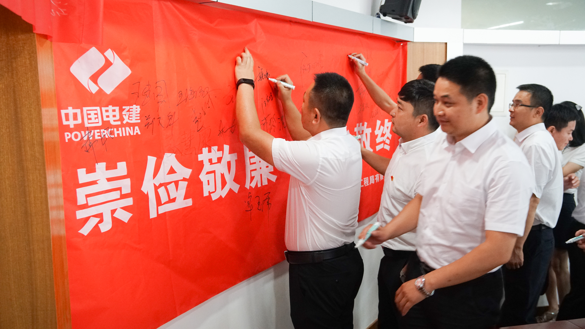 與會(huì)領(lǐng)導(dǎo)和學(xué)員們共同在印有電建股份廉潔核心理念“崇儉敬廉、慎始敬終”的橫幅上簽名,為期1個(gè)月的項(xiàng)目經(jīng)理廉潔從業(yè)專項(xiàng)教育活動(dòng)正式啟動(dòng)。