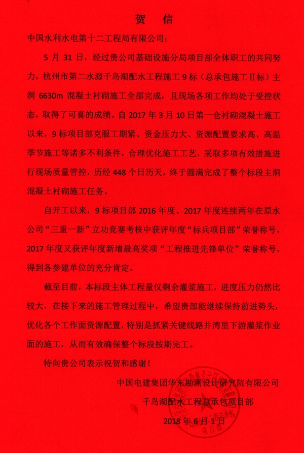 5月31日,經(jīng)過項(xiàng)目部全體職工共同努力,千島湖配水工程施工9標(biāo)(總承包施工Ⅱ標(biāo))主洞6630m混凝土襯砌全部完成。自2017年3月10日施工開始,歷經(jīng)448個(gè)日歷天,圓滿完成了整個(gè)標(biāo)段主洞混凝土襯砌施工任務(wù)。華東院總承包對(duì)項(xiàng)目部取得的成績(jī)給予充分肯定,特向公司發(fā)來賀信!