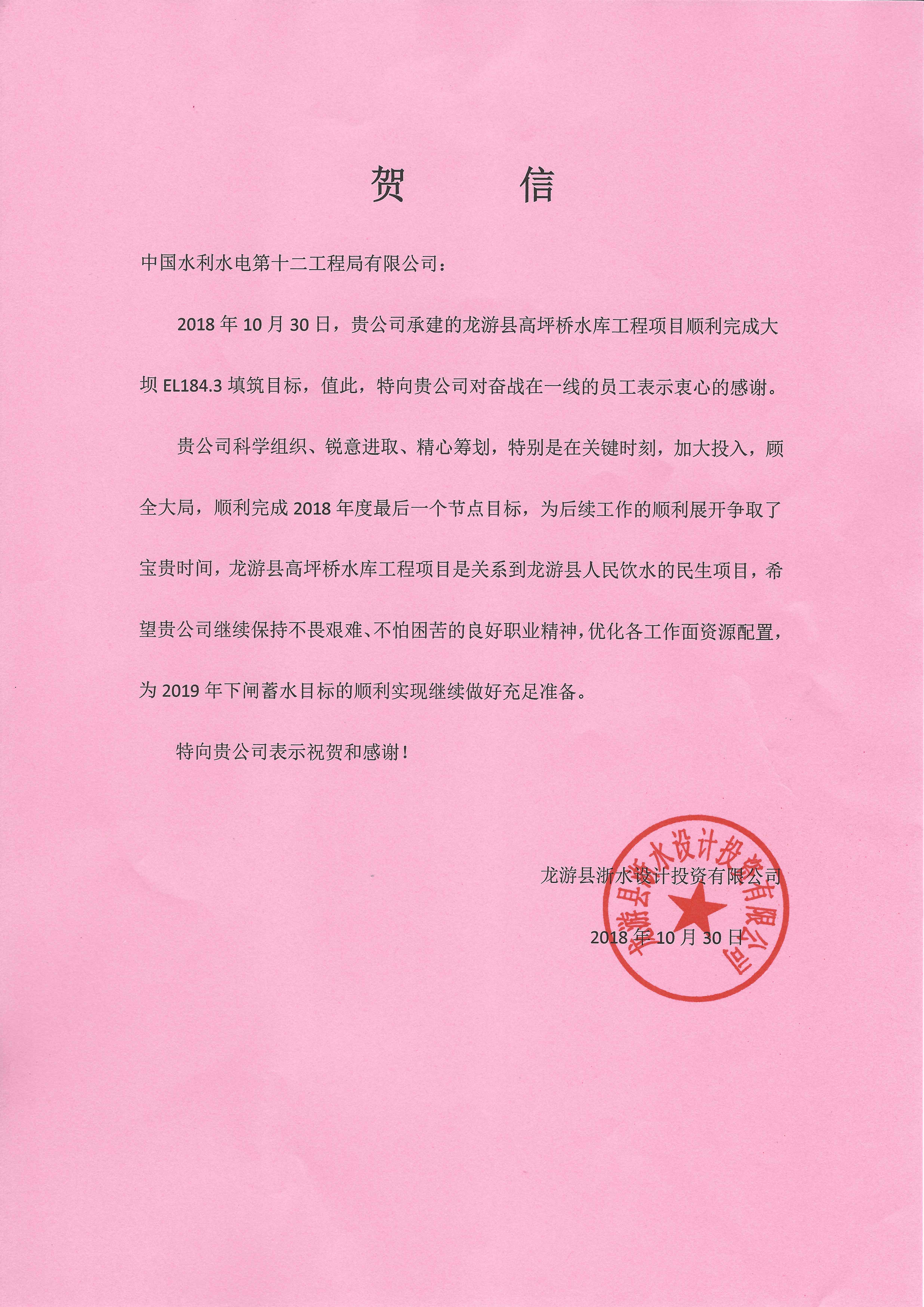 10月30日,公司承建的龍游縣高坪橋水庫工程如期實現(xiàn)攔河壩填筑節(jié)點目標(biāo),這是繼工程實現(xiàn)度汛節(jié)點后完成的又一重大節(jié)點目標(biāo),為2019年面板施工爭取了寶貴時間。龍游縣高坪橋水庫工程建設(shè)管理處和龍游縣浙水設(shè)計投資有限公司發(fā)來賀信。 工程自2017年8月開工以來,一直秉承先進(jìn)的管理理念,采取倒排施工工期、細(xì)化計劃目標(biāo)、優(yōu)化資源配置、加大資源投入等一系列措施抓好進(jìn)度管理;加強組織、安全、技術(shù)、質(zhì)量等各方面管理水平助推精準(zhǔn)履約;實現(xiàn)壩料生產(chǎn)、運輸、碾壓、檢測各環(huán)節(jié)無縫鏈接;現(xiàn)場施工人員爭分奪秒,全天不間斷施工;克服時間緊、任務(wù)重、征地困難等諸多問題,大壩施工有序推進(jìn),安全生產(chǎn)和工程質(zhì)量得到良好保障,各節(jié)點目標(biāo)一一如期完成。