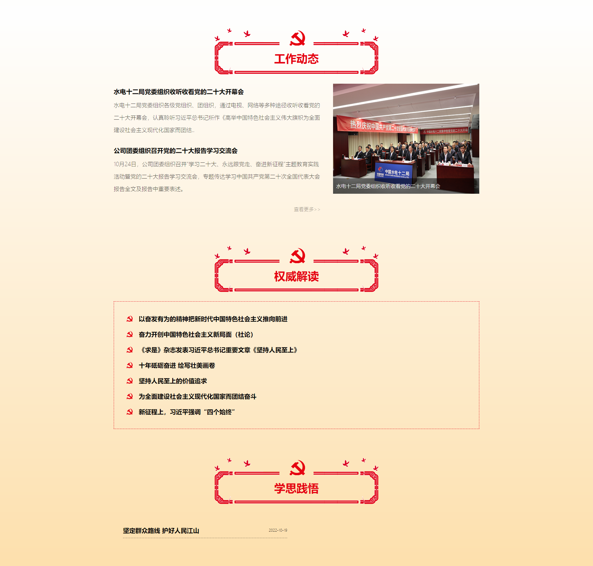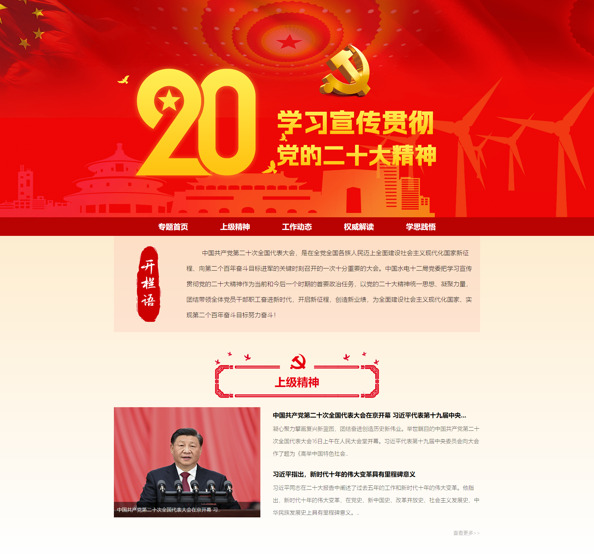 聚焦會(huì)議精神,掀起學(xué)習(xí)熱潮。10月26日,水電十二局“學(xué)習(xí)宣傳貫徹黨的二十大精神”專欄正式在官網(wǎng)上線。 “學(xué)習(xí)宣傳貫徹黨的二十大精神”專欄共設(shè)“上級(jí)精神、工作動(dòng)態(tài)、權(quán)威解讀、學(xué)思踐悟”四個(gè)板塊,其中上級(jí)精神板塊刊發(fā)國家權(quán)威媒體發(fā)布的關(guān)于黨的二十大的系列動(dòng)態(tài)和黨中央、國資委、集團(tuán)(股份)公司對(duì)學(xué)習(xí)宣傳貫徹黨的二十大精神的重要要求。工作動(dòng)態(tài)板塊展示公司總部、所屬單位、項(xiàng)目一線學(xué)習(xí)宣傳貫徹黨的二十大精神的具體舉措和特色做法。權(quán)威解讀板塊刊發(fā)國家權(quán)威媒體解讀黨的二十大精神的重要文章。學(xué)思踐悟板塊展示公司全體黨員干部職工學(xué)習(xí)領(lǐng)悟黨的二十大精神的心得體會(huì),貫徹落實(shí)黨的二十大精神的有力舉措。 水電十二局黨委將全面落實(shí)黨中央、國資委黨委、集團(tuán)(股份)公司黨委學(xué)習(xí)宣傳貫徹黨的二十大精神各項(xiàng)工作要求,把學(xué)習(xí)宣傳貫徹黨的二十大精神作為當(dāng)前和今后一個(gè)時(shí)期的首要政治任務(wù),認(rèn)真組織、周密安排,集中力量把學(xué)習(xí)宣傳貫徹黨的二十大精神抓緊抓好、抓出成效,以學(xué)習(xí)貫徹黨的二十大精神為強(qiáng)大動(dòng)力做好當(dāng)前重點(diǎn)工作,緊盯全年生產(chǎn)經(jīng)營目標(biāo)任務(wù),認(rèn)真抓好提質(zhì)增效穩(wěn)增長工作,大力提升企業(yè)核心競(jìng)爭(zhēng)力,加快建設(shè)現(xiàn)代化一流企業(yè),為全面建設(shè)社會(huì)主義現(xiàn)代化國家、實(shí)現(xiàn)第二個(gè)百年奮斗目標(biāo)貢獻(xiàn)力量。