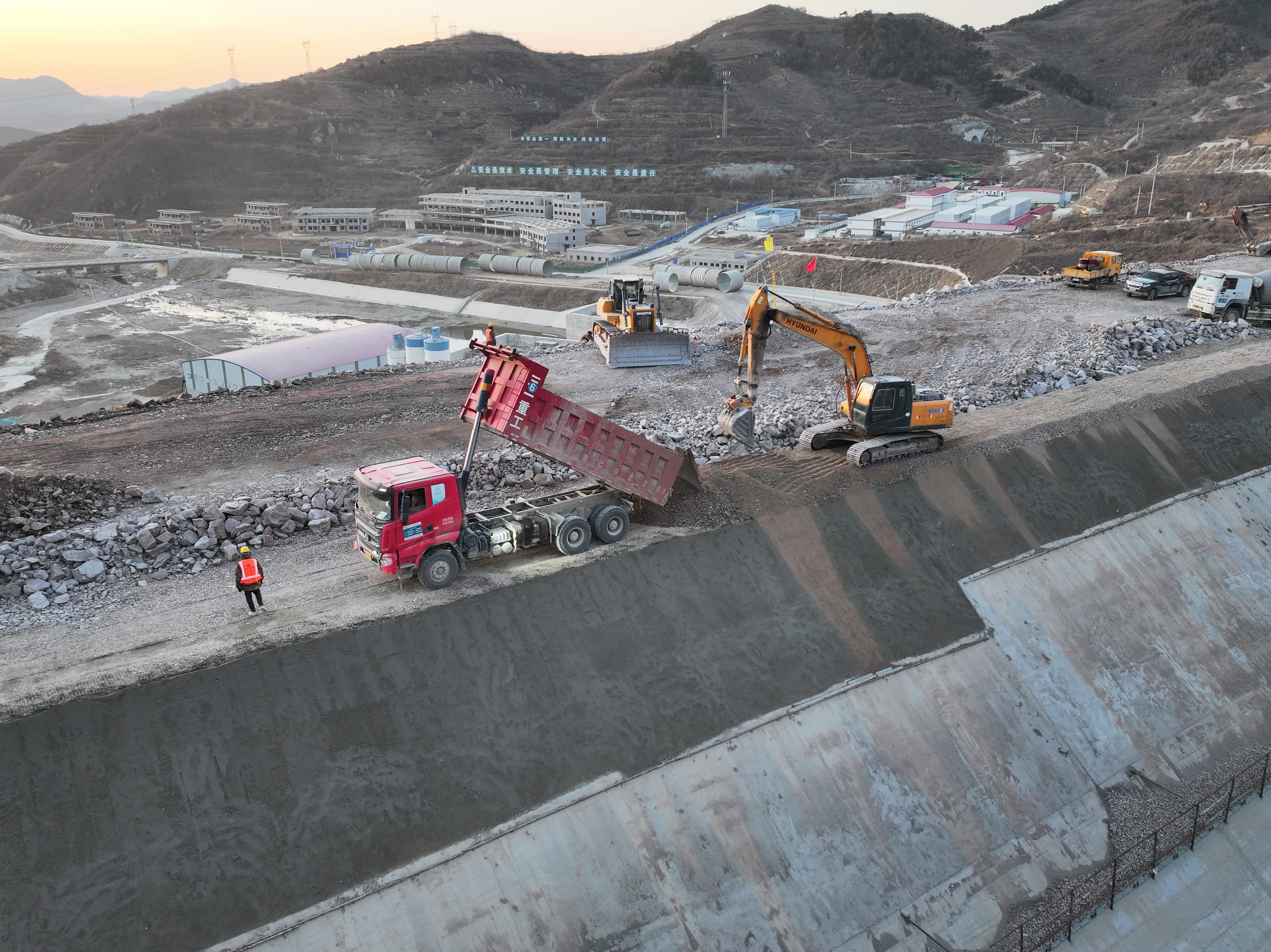 12月25日,水電十二局承建的河北撫寧抽水蓄能電站下水庫面板堆石壩填筑到頂,為后續(xù)面板混凝土施工和下水庫下閘蓄水奠定了堅實基礎(chǔ)。 河北撫寧抽水蓄能電站位于河北省秦皇島市撫寧區(qū)境內(nèi),下水庫大壩最大壩高66米,填筑量為152萬立方米。填筑期間,項目部以“勞動競賽”為抓手,真抓實干,在技術(shù)上找思路,采用新工藝不斷提高填筑效率,提升施工質(zhì)量;在履約上投資源,統(tǒng)籌兼顧,多管齊下,各類工程機(jī)械晝夜不懈干生產(chǎn);在安全上抓落實,學(xué)查結(jié)合,以思想為導(dǎo)向,在實踐中保障施工安全。 河北撫寧抽水蓄能電站項目是國家能源局“十三五”規(guī)劃重點項目,也是秦皇島市的一號工程。電站樞紐工程主要由上水庫、輸水系統(tǒng)、地下廠房、下水庫等組成,電站總裝機(jī)容量1200兆瓦。項目建成后將以500千伏線路接入冀北電網(wǎng),每年可減少標(biāo)準(zhǔn)煤耗10.52萬噸,減少二氧化碳排放24.9萬噸,將極大改善冀北電網(wǎng)電源結(jié)構(gòu),緩解冀北電網(wǎng)調(diào)峰矛盾,增強冀北電網(wǎng)快速響應(yīng)能力,有力服務(wù)和帶動地方經(jīng)濟(jì)社會發(fā)展,為國家早日實現(xiàn)“雙碳”目標(biāo)添磚加瓦。 下一步,水電十二局撫寧抽蓄項目團(tuán)隊將以此次節(jié)點的實現(xiàn)為契機(jī),鉚足干勁嚴(yán)抓質(zhì)量、安全及履約工作,用心打造精品工程,全力沖刺面板混凝土施工和下閘蓄水目標(biāo),爭取早日發(fā)揮撫寧抽蓄電站經(jīng)濟(jì)、社會、生態(tài)多元效益,為助力實現(xiàn)碳達(dá)峰、碳中和目標(biāo)作出更大貢獻(xiàn)。