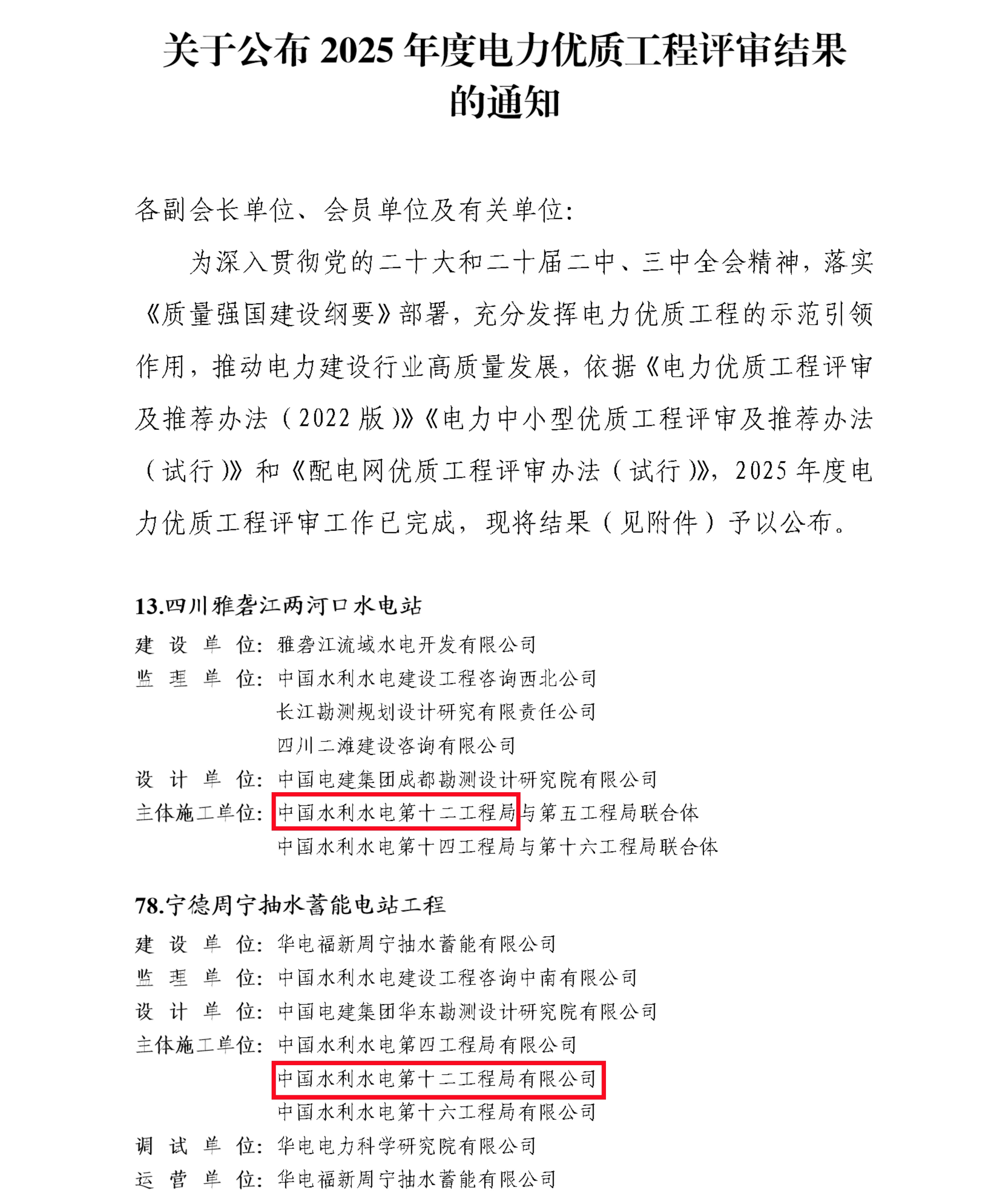 近日,中國電力建設(shè)企業(yè)協(xié)會公布了2025年度電力優(yōu)質(zhì)工程評審結(jié)果,水電十二局承建的四川雅礱江兩河口水電站、寧德周寧抽水蓄能電站工程榜上有名,榮獲2025年度電力優(yōu)質(zhì)工程獎。 雅礱江兩河口水電站是位于四川甘孜藏族自治州,為一等大(1)型工程,擁有世界已建最高礫石土心墻堆石壩,最大壩高303米,水電十二局與水電五局組成聯(lián)合體承擔(dān)大壩主體施工任務(wù)。工程于2014年10月開工建設(shè),2022年3月全部機(jī)組投產(chǎn)發(fā)電。工程建設(shè)期間,項目團(tuán)隊克服了大壩填筑量大、周期長、環(huán)節(jié)多、國內(nèi)外無成熟經(jīng)驗可借鑒等重重困難,解決了冬季凍土快、雨季復(fù)工難、料源種類多、砂板巖含油性碳物質(zhì)等世界級難題,創(chuàng)新了國內(nèi)外高海拔地區(qū)防滲土料凍融防控理論、技術(shù)標(biāo)準(zhǔn)和施工成套技術(shù),開創(chuàng)了大規(guī)模無人駕駛智能碾壓機(jī)群協(xié)同作業(yè)技術(shù),在國內(nèi)外首次實現(xiàn)了大壩施工全過程、全天候、全環(huán)節(jié)、全要素、全覆蓋智能無人碾壓,實現(xiàn)了大壩建設(shè)由數(shù)字化向智能化的新跨越。工程榮獲各類科技成果302項,其中科技進(jìn)步獎18項、優(yōu)秀設(shè)計獎6項、省部級工法20項、QC成果獎44項、國家發(fā)明專利19項,實用新型專利185項。工程建設(shè)踐行“綠水青山就是金山銀山”理念,積極推進(jìn)“四節(jié)一環(huán)保”的應(yīng)用,獲得中國環(huán)境保護(hù)示范項目,綠色建造施工水平三星項目,高分通過綠色施工專項評價。 周寧抽水蓄能電站位于福建省寧德市周寧縣境內(nèi),是福建省“十四五”首個全面投產(chǎn)發(fā)電的抽水蓄能電站,總裝機(jī)容量120萬千瓦,平均年發(fā)電量12億千瓦時。水電十二局承擔(dān)引水系統(tǒng)、地下廠房、尾水系統(tǒng)、金結(jié)制安等任務(wù)。工程于2017年1月主體工程開工建設(shè),2022年8月全部機(jī)組投產(chǎn)發(fā)電。工程榮獲2023年全國優(yōu)秀焊接工程一等獎、省部級及以上科技成果獎20余項。電站投產(chǎn)發(fā)電以來,累計發(fā)電26.11億千瓦時,減少標(biāo)準(zhǔn)煤消耗約45.24萬噸,二氧化碳排放約90.47萬噸,對改善附件電網(wǎng)電源結(jié)構(gòu),提高電網(wǎng)運行的經(jīng)濟(jì)性、安全性和穩(wěn)定性具有重要意義。 近年來,公司開展全過程質(zhì)量控制活動,倡導(dǎo)一次成優(yōu);嚴(yán)格落實工程建設(shè)標(biāo)準(zhǔn),強(qiáng)化工程過程質(zhì)量管控按“項目前期、工程準(zhǔn)備、工程施工、項目竣工”四個階段全過程質(zhì)量管控;踐行智能建造,積極應(yīng)用新技術(shù)、新工藝、新材料,全面提升工程質(zhì)量工藝和管理水平;充分發(fā)揮電力優(yōu)質(zhì)工程的示范引領(lǐng)作用,持續(xù)提升工程建設(shè)品質(zhì),全力打造精品工程、示范工程,為公司戰(zhàn)略轉(zhuǎn)型和高質(zhì)量發(fā)展奠定堅實基礎(chǔ)。
