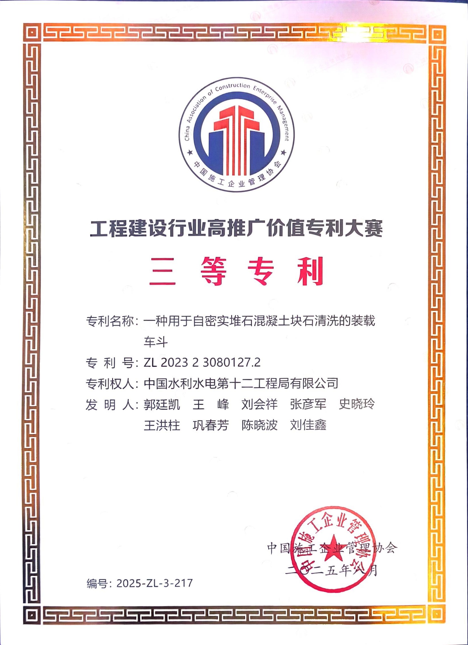 日前,公司新增一項發(fā)明專利《一種自密實堆石洗石裝置及其洗石方法》。 該發(fā)明提供了一種自密實堆石洗石裝置及其洗石方法,主要包括兩第一清洗板,兩第一清洗板相對的側(cè)壁上均轉(zhuǎn)動連接有第二清洗板,且兩第二清洗板側(cè)壁轉(zhuǎn)動連接,第一清洗板與第二清洗板內(nèi)部均開設(shè)有清洗通道,第一清洗板與第二清洗板底部均開設(shè)有出水通道,出水通道與清洗通道連通,清洗通道內(nèi)固定有用于清洗的清洗管,清洗管正對于出水通道的位置開設(shè)有若干清洗孔。 該裝置創(chuàng)新提出了可自由變形清洗平臺與多自由度智能調(diào)節(jié)機構(gòu)結(jié)合的施工現(xiàn)場嵌入式洗石技術(shù),已成功應(yīng)用于東鄉(xiāng)區(qū)井山水庫大壩工程,其中該專利的部分裝置“一種用于自密實堆石混凝土塊石清洗的裝載車斗”獲得中國施工管理企業(yè)協(xié)會工程建設(shè)行業(yè)高推廣價值專利大賽三等專利,解決了傳統(tǒng)洗石裝置固定式需專用場地、卸料與清洗流程分立導(dǎo)致的施工效率低、資源消耗大的痛點,實現(xiàn)卸料與清洗同步化,大大提高了施工效率。